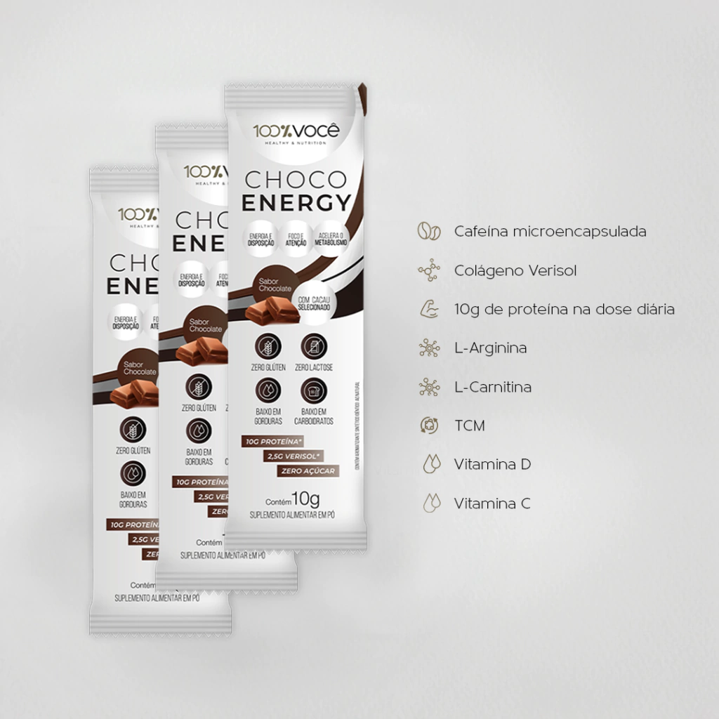 O Choco Energy sabor Chocolate foi pensado para oferecer doses diárias de energia¹, concentração e foco², com efeito duradouro³, sem picos e oscilações.